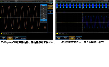 500Mpts/CH的深度存儲器,示波器即使在慢時基檔位下依然保持(chí)高的采樣率和快的波形捕獲率。全(quán)硬件視窗擴展,可局(jú)部放大觀察波形的細(xì)節,為您提供波形全局與細節的同步顯示。