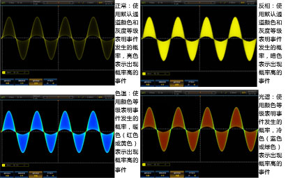 4456係(xì)列示波器采(cǎi)用數字熒光三維顯示技術,通過顏色的(de)亮暗(àn)或冷暖(nuǎn)來表示事件(jiàn)發生(shēng)的概率,並提供正常、反相、色溫、光譜等4種波形色彩,增強了查看偶發事件的能力。