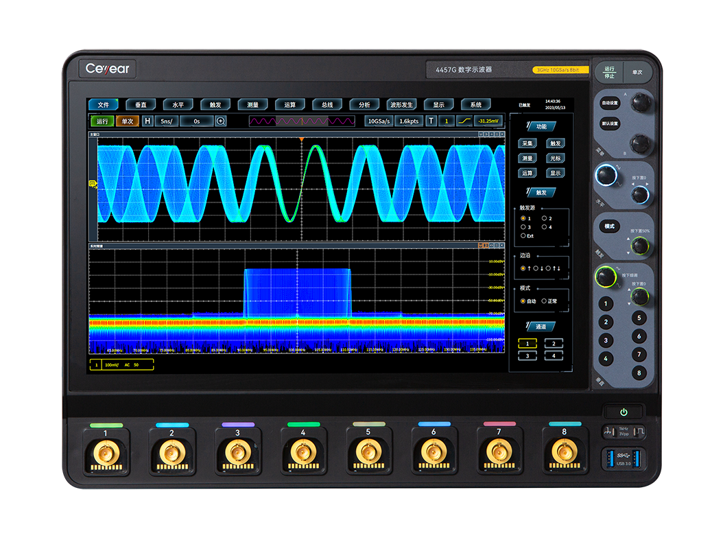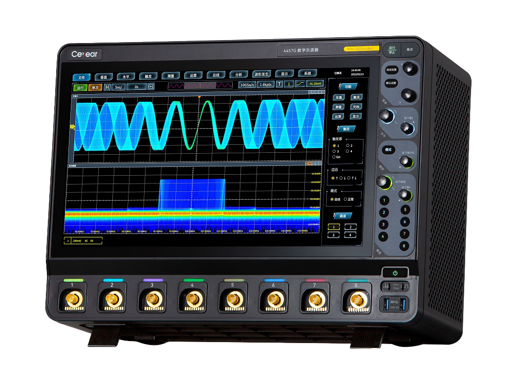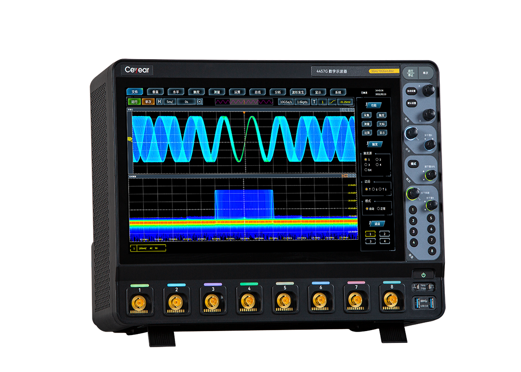 4457係列數字示波器集示波器、邏輯(jí)分析儀、函數發生器、總線分析儀、實時頻譜(pǔ)分析儀(yí)及數字電壓表(biǎo)等多種儀器於一體,具有波(bō)形自動設置、參數自動測量與統計、光標(biāo)測量、數學(xué)運算(suàn)、FFT頻譜(pǔ)分析、波形錄製與回(huí)放、串行總線分析、極限模板測試、功率測量與分析、波特圖分析、眼(yǎn)圖及抖動分(fèn)析等功能,支持以(yǐ)太網(wǎng)程控,方便集成開發使用(yòng)。