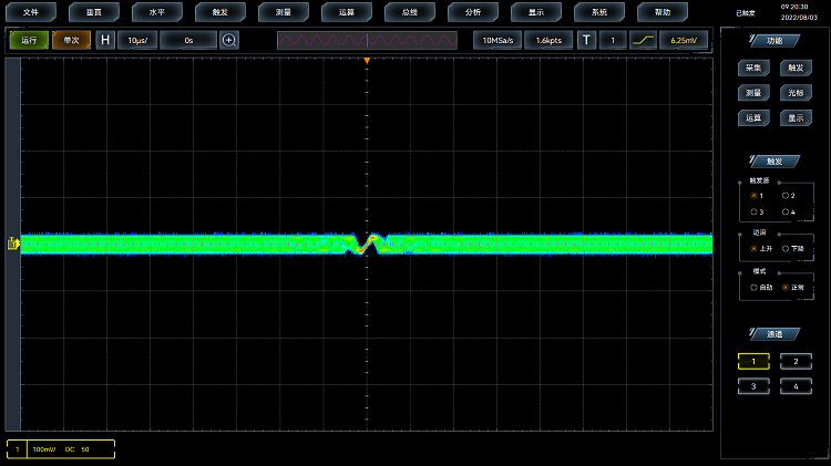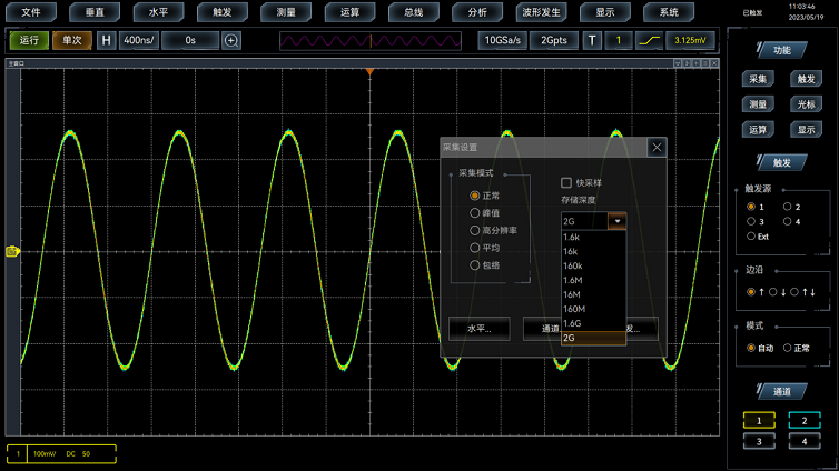 2Gpts的深度存(cún)儲器,示波器在慢時基檔位下依(yī)然保持高的采樣率和快的(de)波形捕獲率。全硬件視窗擴展,可局部(bù)放大觀察波形的細節,為您提供(gòng)波形全局與細節的同步顯示。