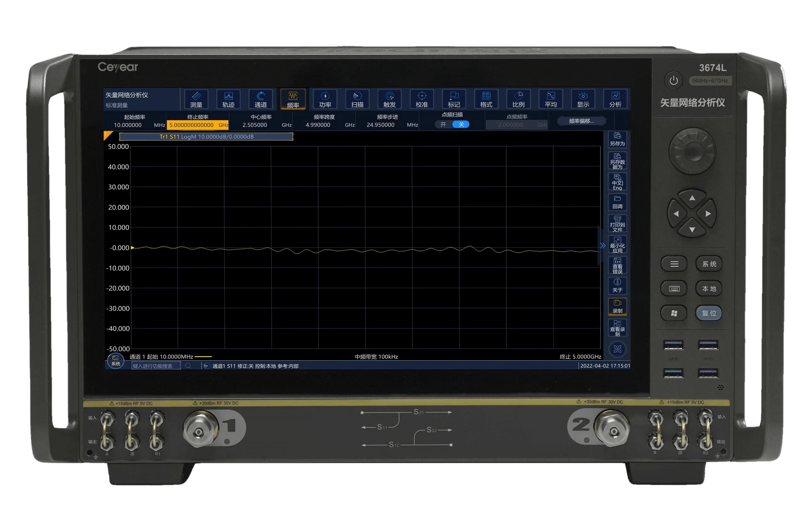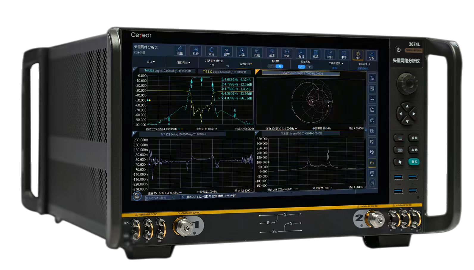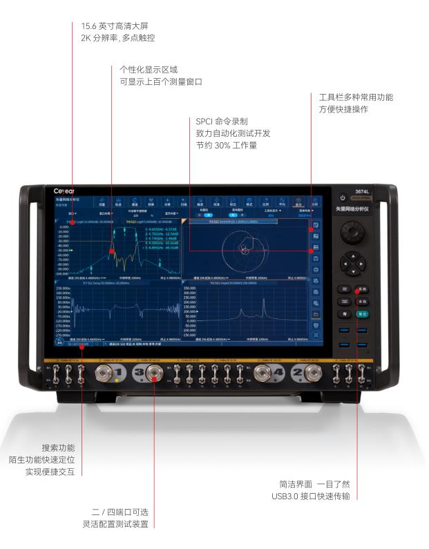 Ceyear 3674係列矢量網絡分析儀是技術創新的巔峰之作,可以輕鬆應對半導體芯片(piàn)測試、材料測試、天線測試、高速線纜測試(shì)、微波部組件測試等帶來的嚴峻挑戰。出色的射頻特性、靈活的硬件(jiàn)配置和豐(fēng)富的軟件功能相輔(fǔ)相成,隻需一次連接即可完成多(duō)種測量任務。創新的人機交互設計可幫助您快速便捷地完成所需的測(cè)量設置(zhì),超大觸摸屏為您帶(dài)來靈活、高效的操作體驗。