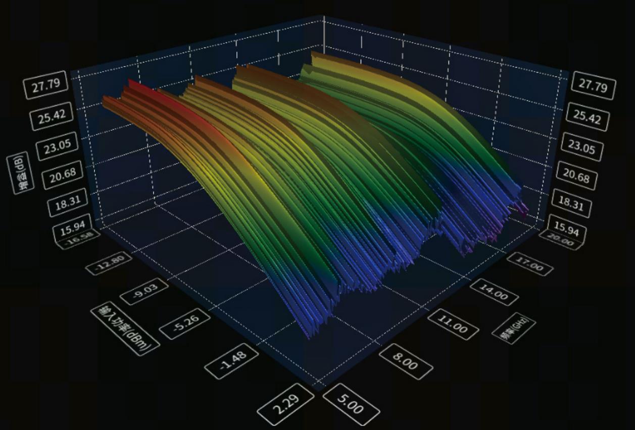 提供三維視圖功能,更好(hǎo)地展示被測件在激勵狀態下的工作性能,另外還可以展示頻率切麵和功率切麵,可以直觀(guān)展現被測件在每個頻率點(diǎn)和每個功率點的特性。