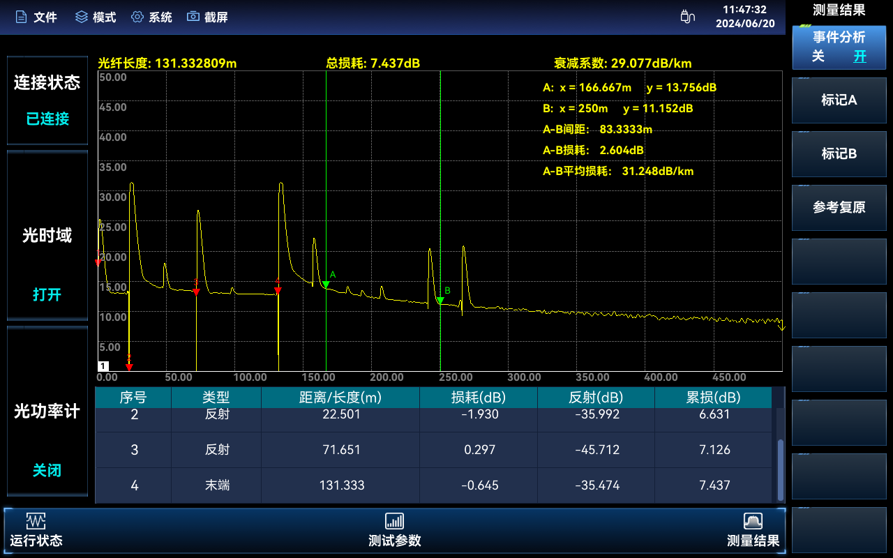 光功率計校準波長850/980/1270/1300/1310/1490/1550/1577/1625/1650nm,測量範圍典型值-50dBm ~+20dBm(和OTDR共用單光口)