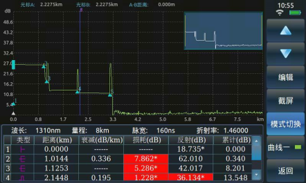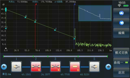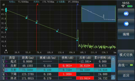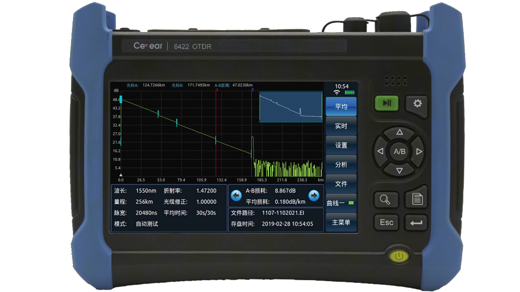 6422 的自(zì)動測試功能使得用戶無需了解更多(duō)的有關該儀(yí)器操作的細節,測試步驟變得非常簡單,隻(zhī)需要將光纖接入產品對應 OTDR 端口、點擊【測試】按鈕即(jí)可,儀(yí)器會自動設置相應(yīng)的測試條件並最(zuì)終給出測試結果,包括測試曲線和事件列表等。
