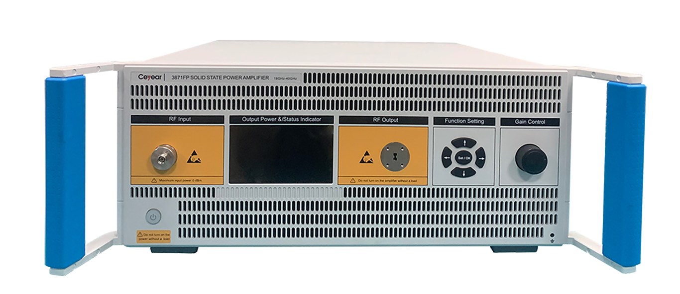 固態功率放大器前麵板設計簡潔明了,其中3871係(xì)列具有(yǒu)用戶界麵友好及操作簡單方便等(děng)特(tè)點,工作頻(pín)率最高可達170GHz,可分頻段實現相應工作頻率範圍內輸入信號的功率放(fàng)大。