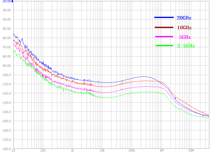 優異的(de)相位噪(zào)聲指(zhǐ)標:-110dBc/Hz@10kHz(10GHz載波,典型值1)