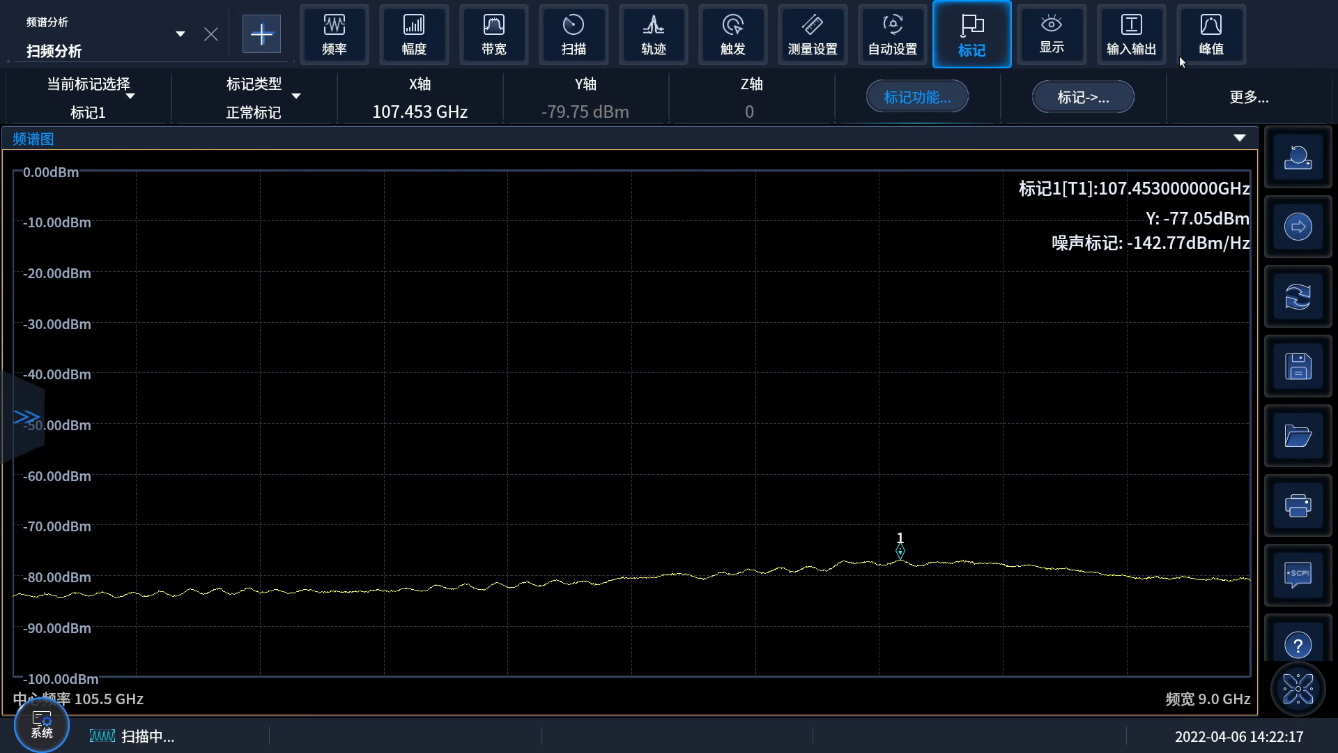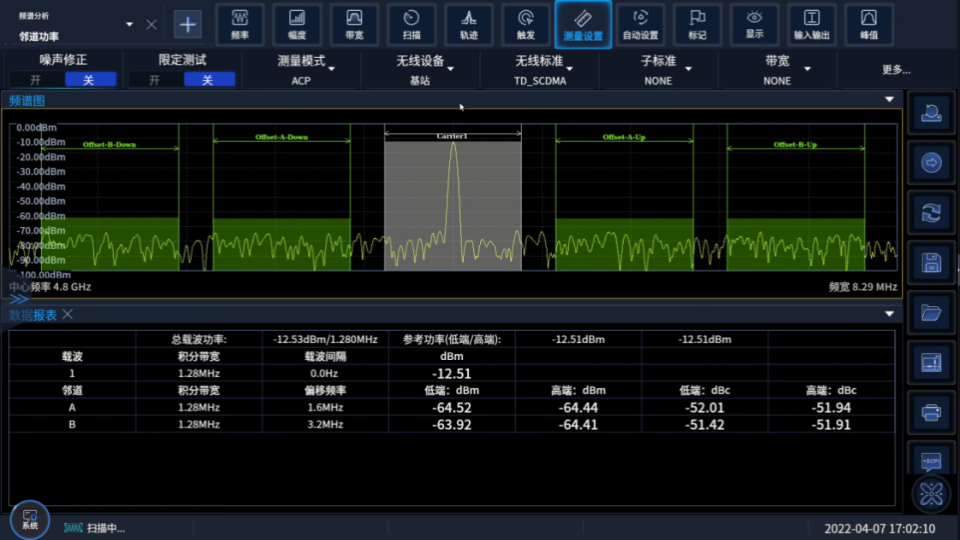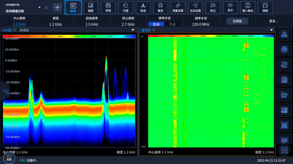 Ceyear 4082係列信號/頻(pín)譜分析(xī)儀支持掃頻和FFT兩種掃描類型,掃描點數在101~120001之間任意可選,最(zuì)長掃描時間(jiān)16000s,零頻寬最短掃描時間1us;支持6條軌跡配置、6種檢波方式、3種平均類型,具有噪聲標記、帶寬功率、功率譜(pǔ)密度等豐(fēng)富的標記測量功能,並支(zhī)持軌跡統計、軌跡自動保(bǎo)存和調用等;支持曆史軌(guǐ)跡的瀑布圖顯示,可保(bǎo)存(cún)10000幀的瀑(bào)布圖軌跡,清晰展現信號頻譜變化規律;具備占用帶寬、鄰/信道(dào)功率、功率統計(jì)、突(tū)發功率、諧波(bō)失真、三階(jiē)交調、雜散發射、頻譜發射(shè)模(mó)板等一鍵功能(néng),可提供更全麵、細致的分析結果。