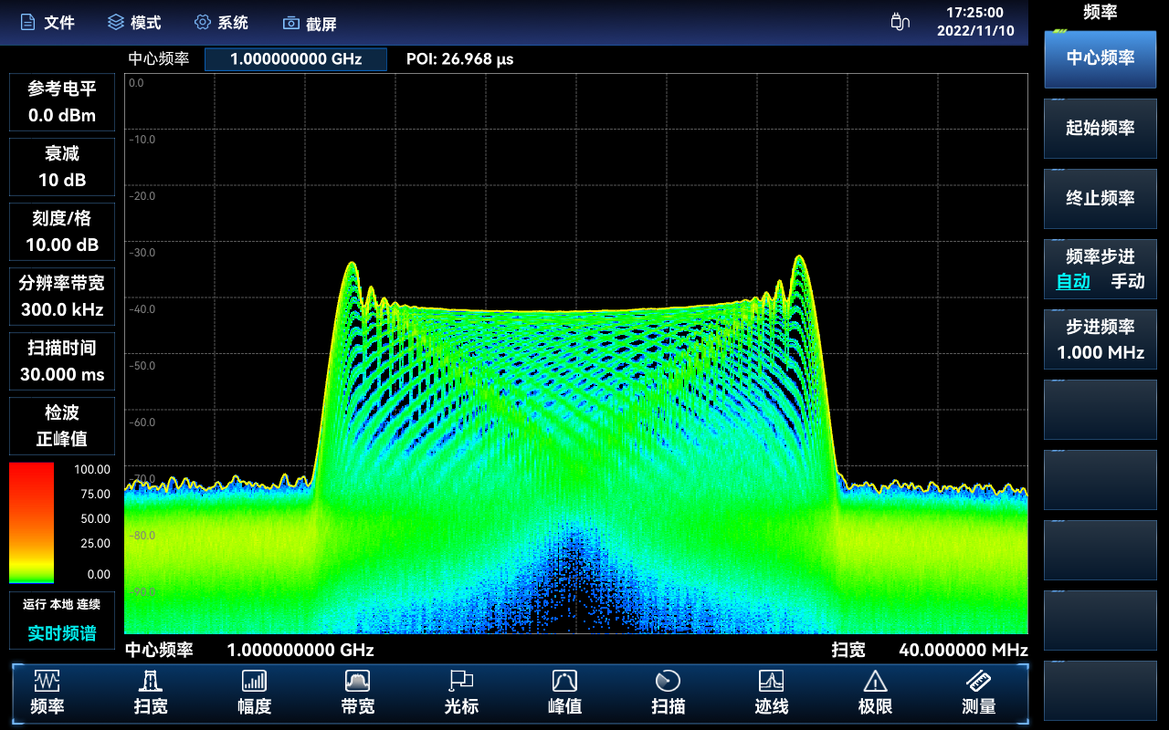 射頻圖譜:類似於頻譜分析模式,顯示調製信號的頻譜圖,可進行占用帶寬的(de)測量。