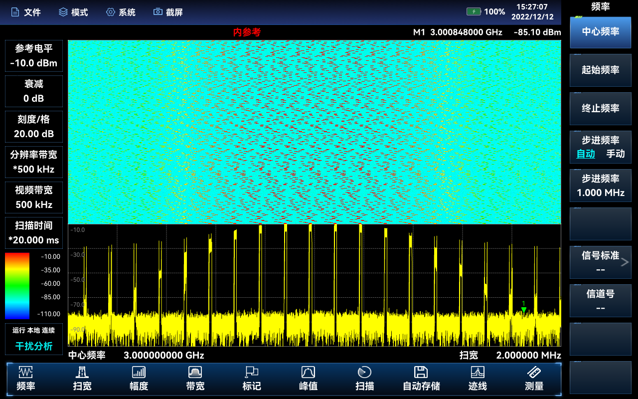 幹擾(rǎo)分析選件具有頻譜測量、瀑布圖和RSSI測量功能,其中瀑布圖使用頻(pín)率-幅度-時間三維的顯(xiǎn)示方式,可以方便的觀(guān)測周期性或者間斷的信號,在瀑布圖中顯示顏色的不同反應(yīng)信號幅度(dù)的強弱,RSSI(接(jiē)收(shōu)信號強度指示)主要用於測量一個點頻信號在一個時(shí)間段內的強度變化情況,瀑布圖和RSSI測量均支持信號的自動存(cún)儲功能(néng)。