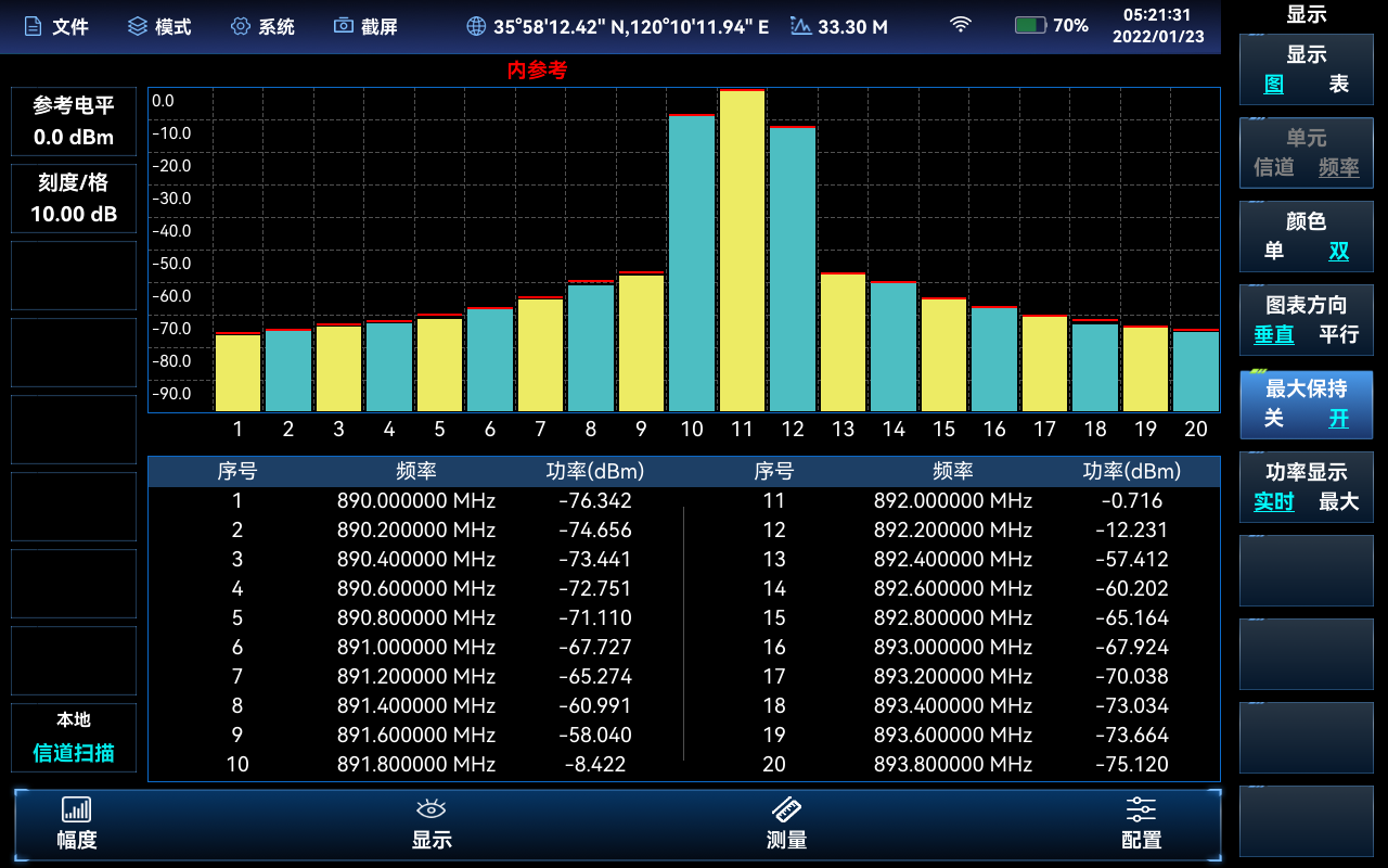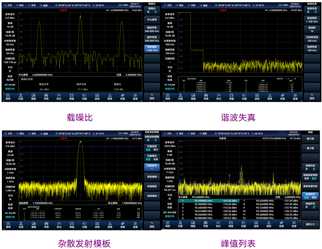 多種智能測量功能:通道功率、占用帶寬、鄰道功率、頻譜發射模板(bǎn)、載(zǎi)噪比、諧波失真(zhēn)、雜散發射(shè)模板、室(shì)內/室外地圖覆蓋等,支(zhī)持GPS/北鬥(dòu)定位(wèi)及對機內晶振的頻率馴(xùn)服校準功能,GPS鎖定校準後的頻率參考精度典型值可達到±10ppb;