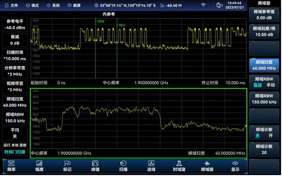 時間門(mén)掃描功能用(yòng)於對時(shí)分信號進行幹擾排查,時間門掃描功能分為時域(yù)窗口和頻域窗(chuāng)口,時域窗口中可以通(tōng)過設置【門延遲】和【門寬度】選取(qǔ)特定(dìng)時間段的信號(hào),選取信號的頻域結果會在頻域窗口中顯示,時間門(mén)掃描模式(shì)是零掃寬狀態,搭配各種參數設(shè)置可從時域上區分(fèn)TDD信號中的上行幀和下行(háng)幀,通過設置【門延遲】和【門寬(kuān)度】可以將上行信號選取出來,從而達到“過濾”下(xià)行信號的效果(下行信(xìn)號會對幹擾信號查找帶來影(yǐng)響(xiǎng))。