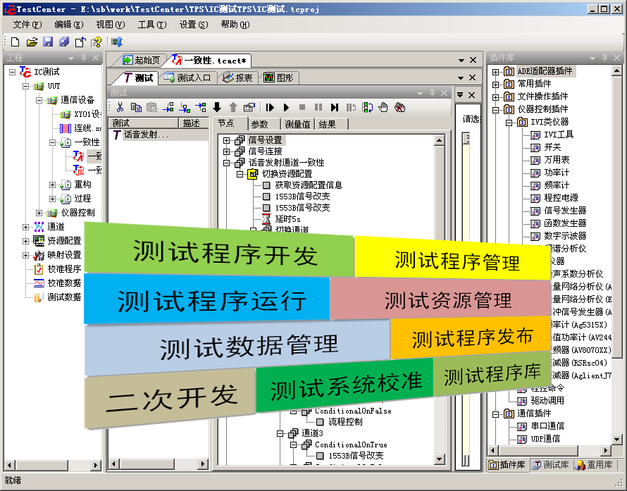 TestCenter軟件平台為用戶自動測係統(tǒng)軟件的研製提供立即可用的完整解決方案,它提供的工具集(jí)合涵(hán)蓋了自動測試係統軟件的通用基礎功能,包括測試程序開發、測試程序執行、測試資源管理、測試數據管理、測試軟件發布等。
