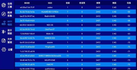 Ceyear 5251A手持式5G裝(zhuāng)維(wéi)智能檢測儀(PDA)支持 IEEE 802.11 a/b/g/n/ac/ax,WiFi 支持 160MHz頻(pín)寬。在理想環境下1000M帶寬,使用SPEEDTEST APP測速不低於1200Mbps。通過啟動終端的WiFi功能(néng),並配合WIFI測(cè)試和測速軟件(jiàn),可測試空間中存在的無線信(xìn)號,以及各無線信號占用的信道、信號強度,MAC地址等(děng)詳細信(xìn)息,對現網的無(wú)線質量、無線速(sù)率進行測(cè)試評估。